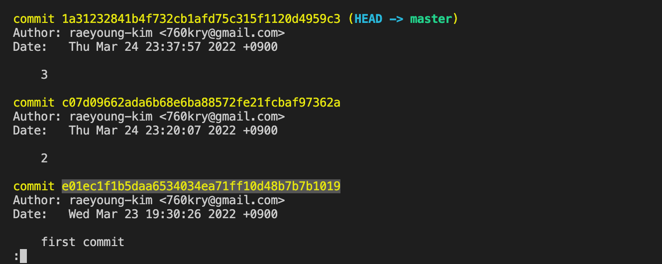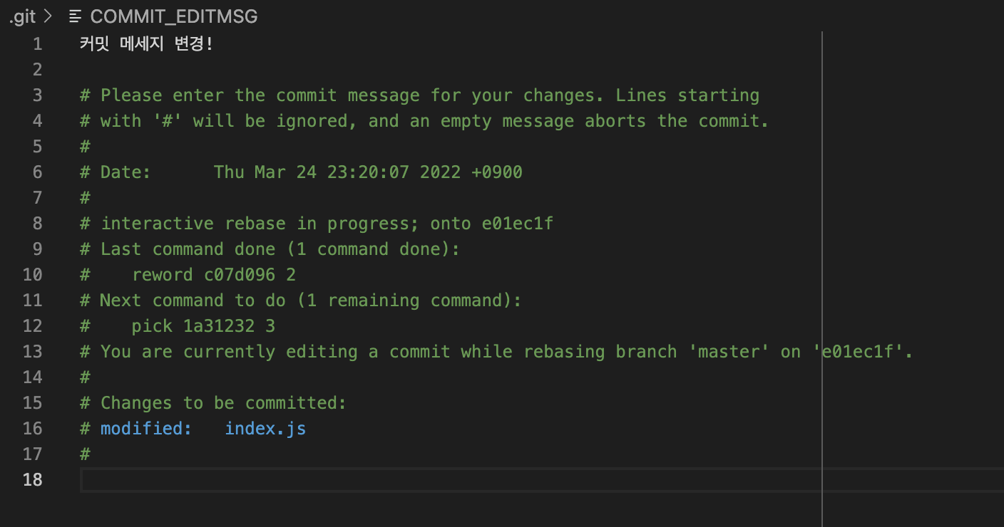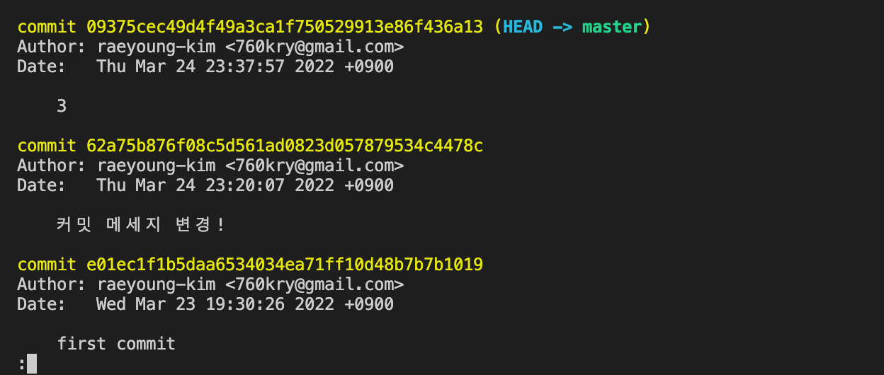 git log를 확인해 보면 특정 커밋 메세지가 변경된 것을 확인할 수 있다.