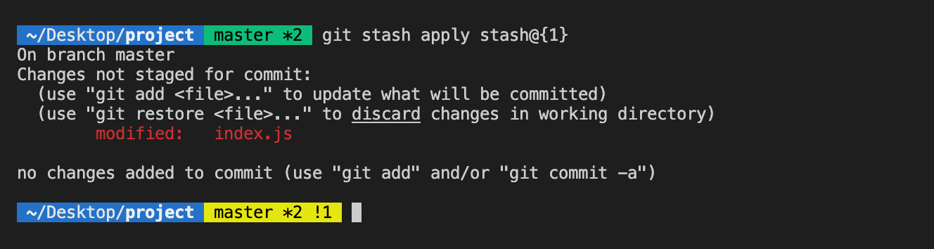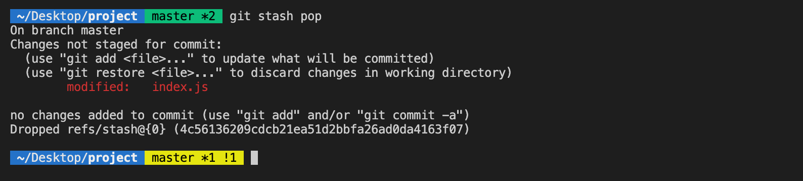 - 위 명령어를 사용할 경우 stash stack 가장 위에 쌓인 저장물이 스택에서 빠져나오면서 적용된다.